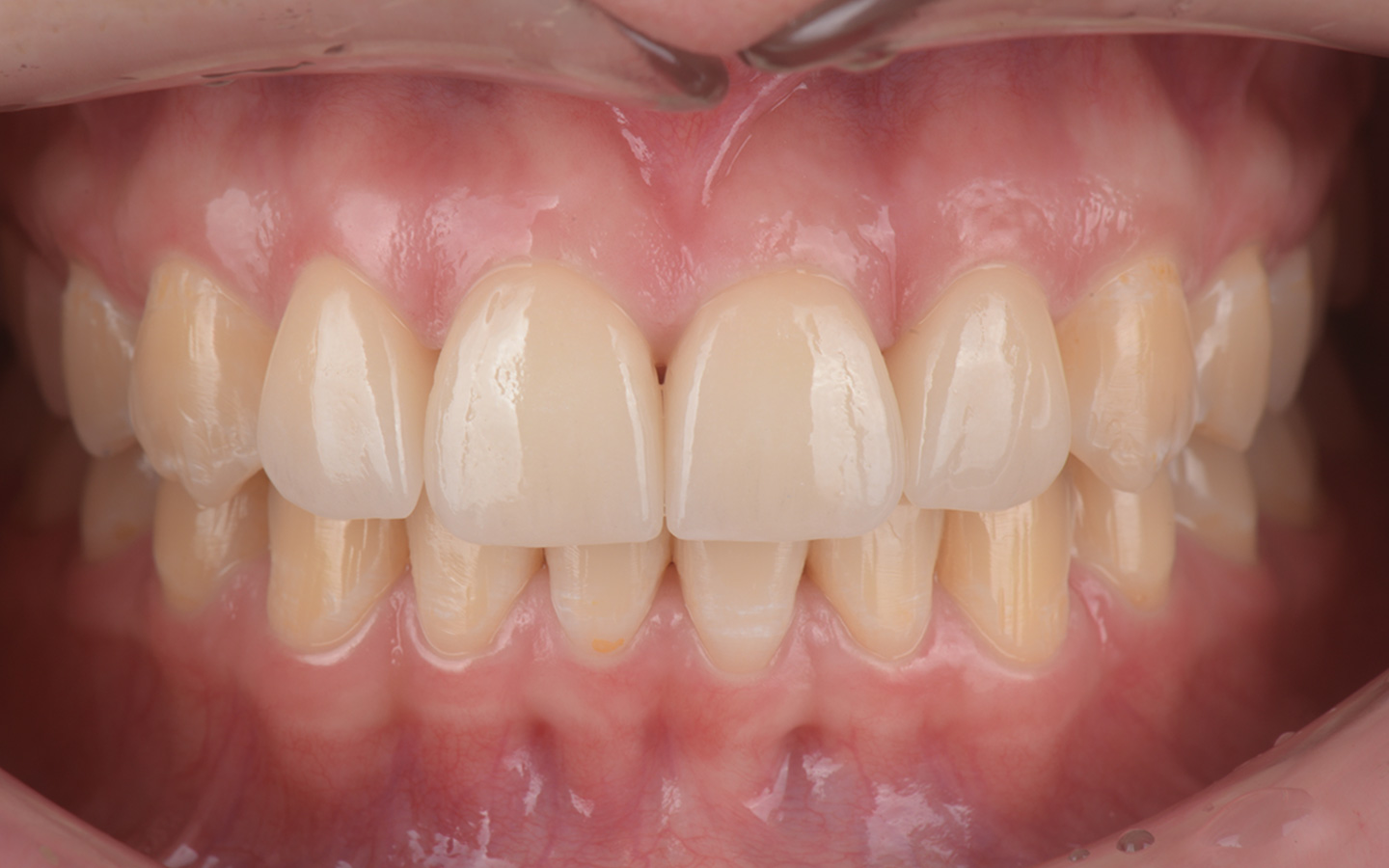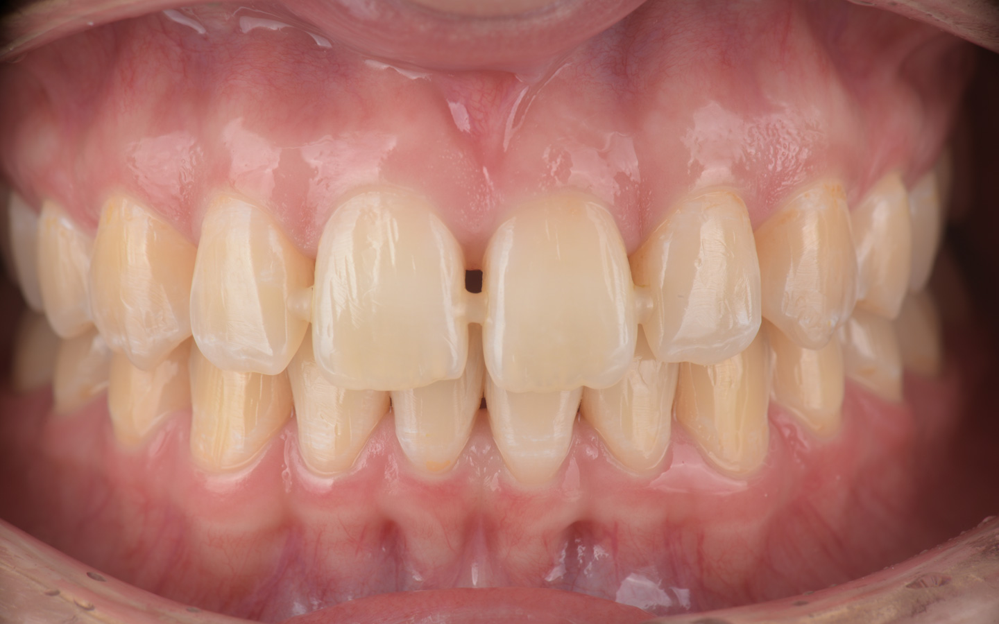 после проведения ортодонтического лечения, нормализации формы зубных рядов и положения отдельных зубов пациентку беспокоили щели между зубами