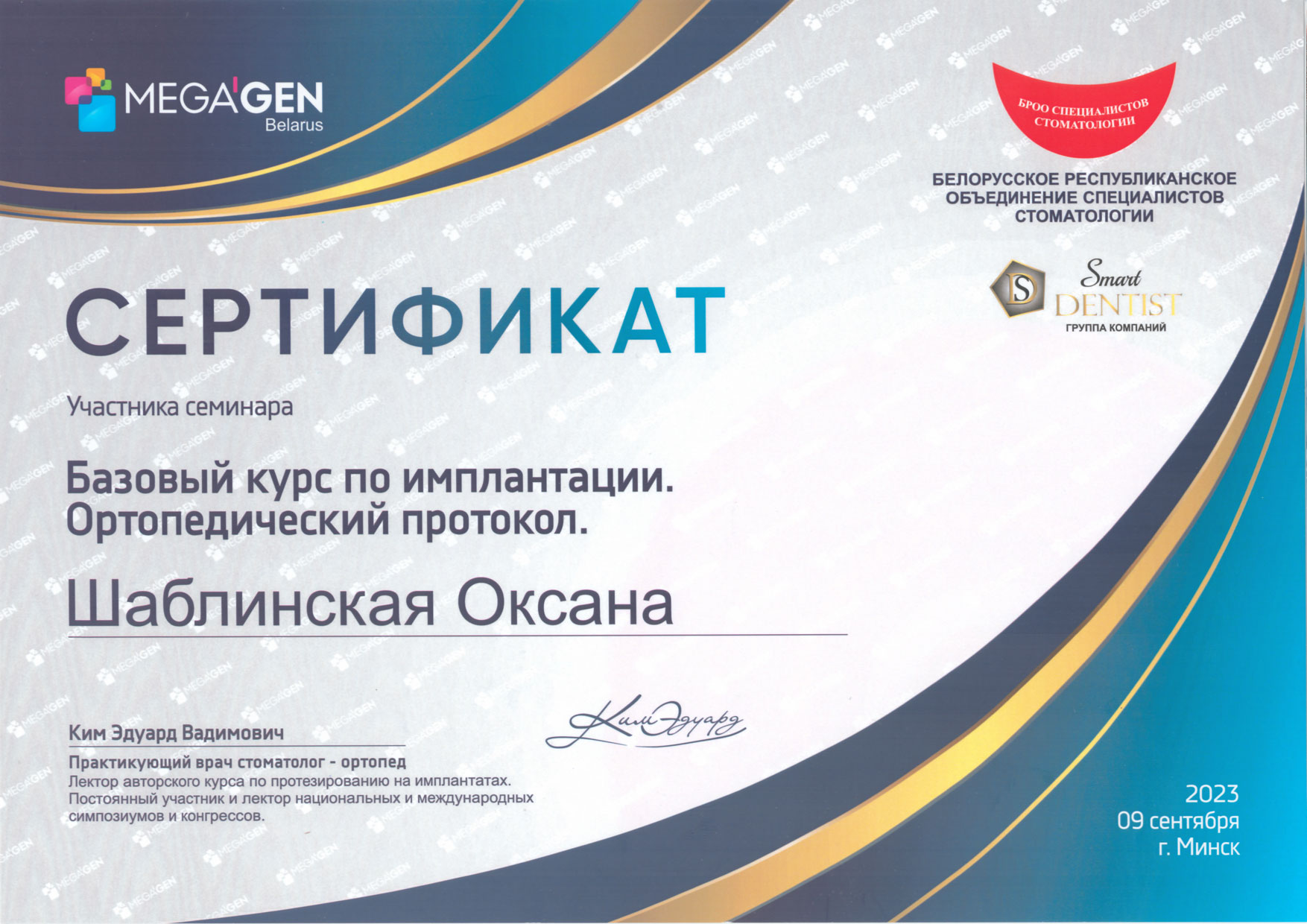 Уже на третьем курсе университета я чётко определилась с ортопедической стоматологией как своим основным направлением. Впоследствии я углублялась в эту сферу, пройдя обучение в клинической ординатуре на кафедре ортопедической стоматологии БГМУ. За плечами — 12 лет опыта работы в государственных и частных клиниках Минска. Этот путь научил меня не только профессиональному подходу, но и ценности командной работы. Для меня важно работать в команде: несколько взглядов всегда позволяют находить наиболее эффективные и продуманные решения для наших пациентов.